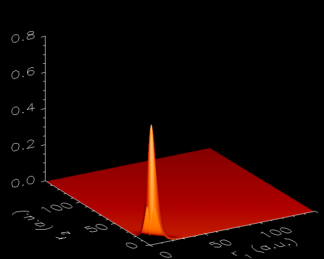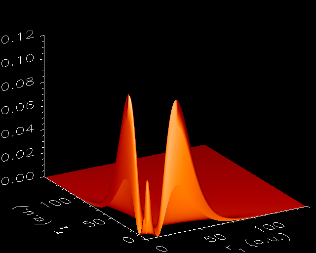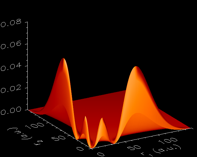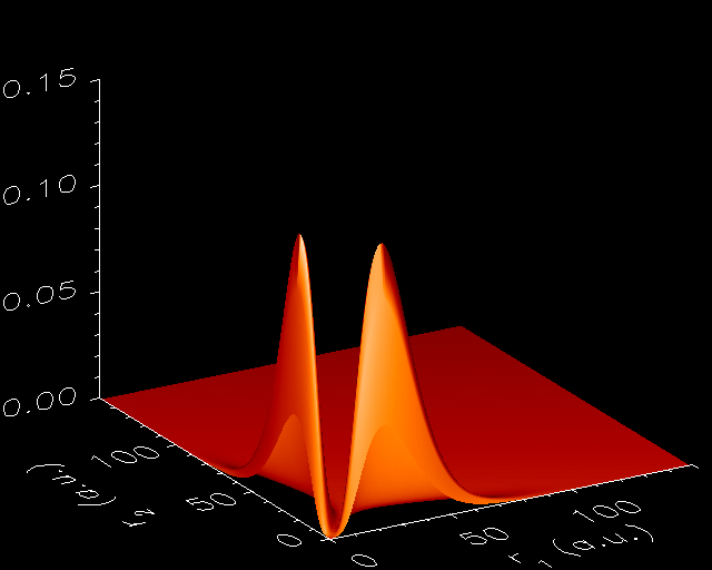 Probability densities of the first wave functions obtained with both the constrained damped relaxation and the direct diagonalization methods. From left to right and up to down: 1s